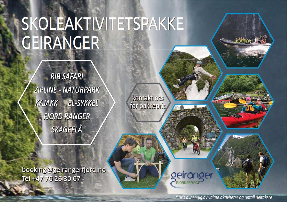 Hos Geirangerfjordservice får dere komplette pakker for en fantastisk klassetur i Geiranger. Dere får aktiviteter med masse action, adrenalin og spenning. Nye utfordringer gir læring og mestring på en helt annen måte enn i klasserommet og utvikler godt samarbeid mellom elevene.