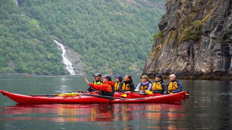 Vi starter ved kajakksenteret i Homlong og padler nedover fjorden til vi kan se det velkjente fossefallet De syv søstre. Her får du en fantastisk utsikt mot Dalsnibba og de majestetiske fjellene som ruver høyt over Geiranger. Videre padler vi ut og forbi Ørnevegen. Underveis vil guiden dele historier om hvordan det var å bo i en liten bygd innerst i Geirangerfjorden, og hvordan landskapet har blitt formet gjennom hundrevis av år.